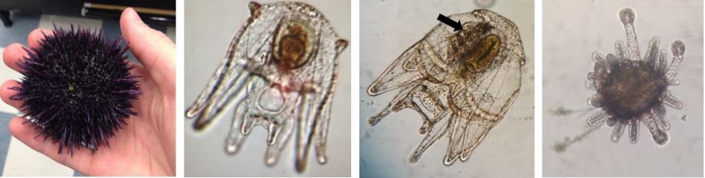 The sea urchin larvae will consume algae as it grows. They will gradually grow a small organ, called a rudiment, to the left of their gut. This structure will grow larger within the body compartment, until the larva is ready to undergo metamorphosis. The exact cue is unknown, but it may be influenced by nutrient levels in the environment, and the thyroid hormone chemical is also known to be involved. Regardless of the cue, when metamorphosis happens, the rudiment will literally burst from the side of the larva’s body, and the body compartment itself is absorbed or discarded. If you’ve seen the movie Alien, its almost like the famous scene where the creature erupts from the man’s stomach. This final act of the metamorphosis is dramatic and occurs in minutes or over a few hours. The result is a tiny baby sea urchin, in the form we expect. During the process, when the adult sea urchin is born, you can even see the first tiny spines peaking out of the larval body compartment.